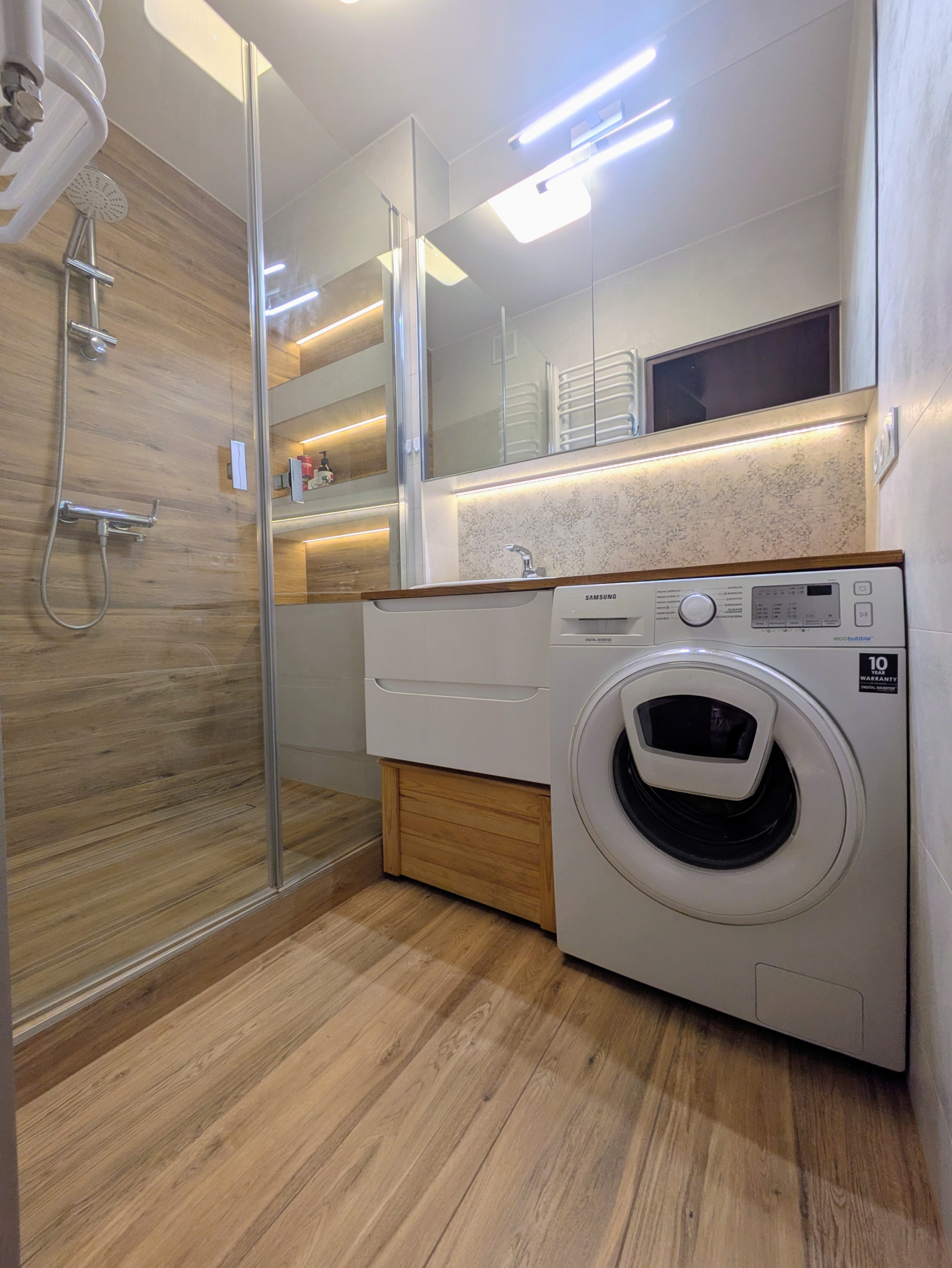 - Podwójny przedpokój z przemyślaną zabudową szaf i szafek