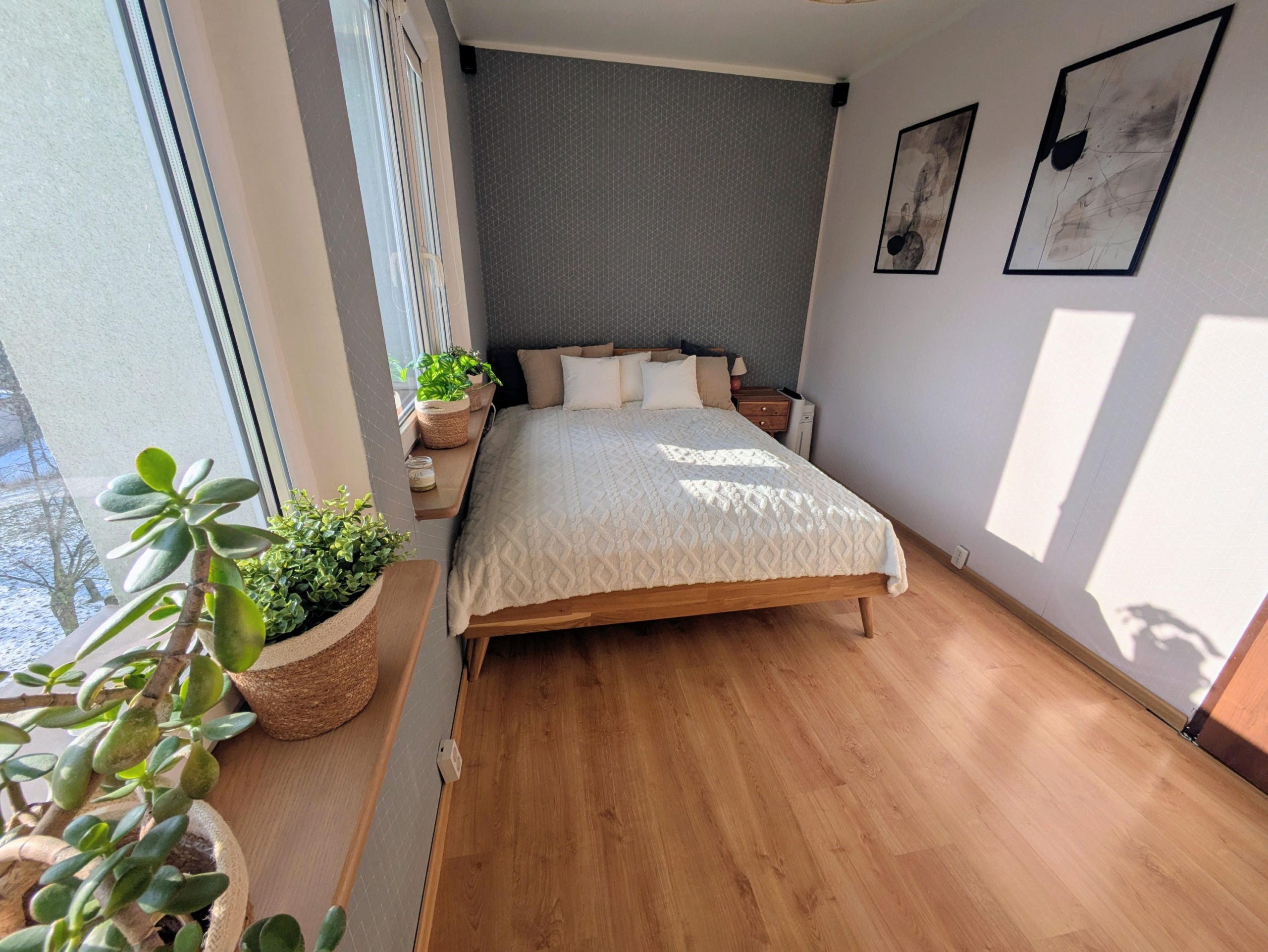 - Dwie wygodne sypialnie (ok. 11 m² każda) – w każdej pojemna zabudowana szafa