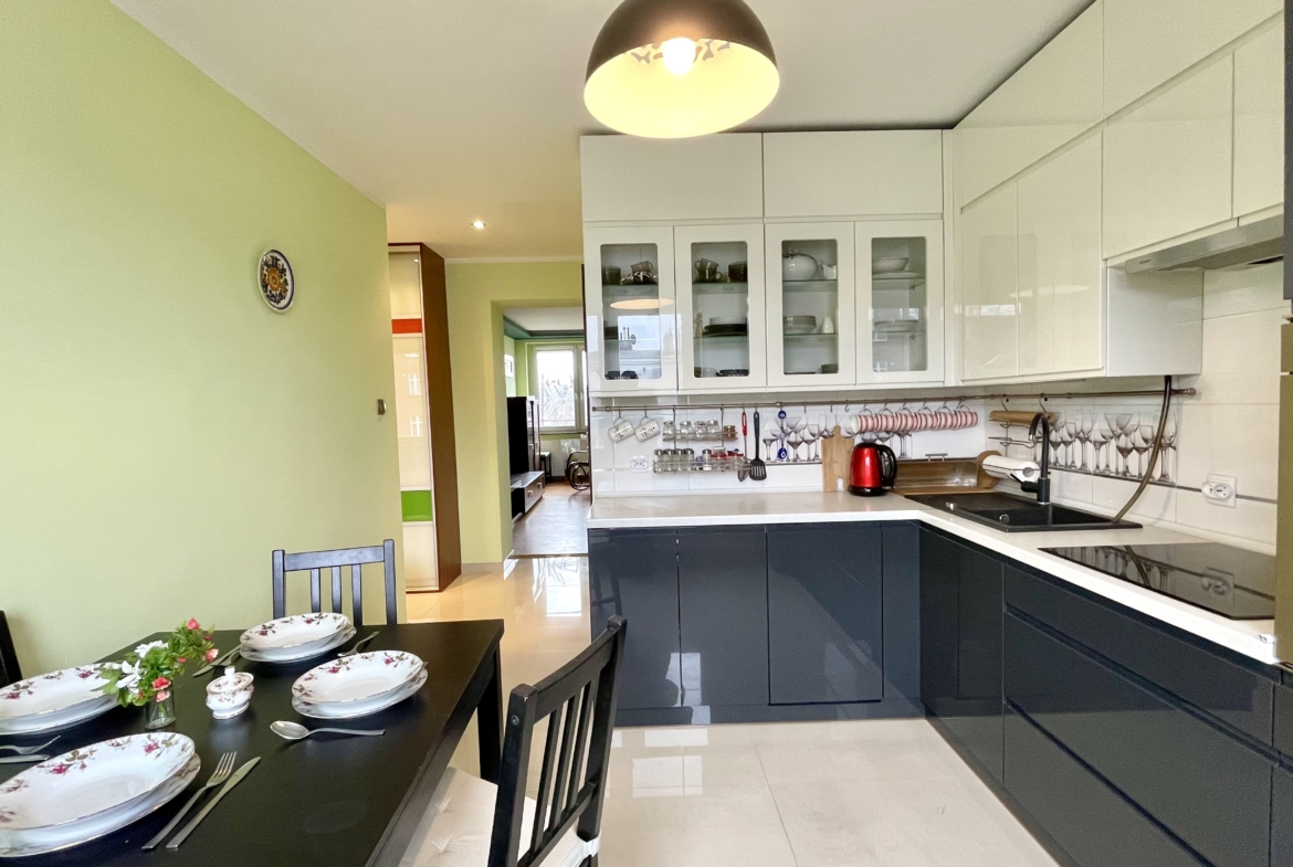 - dużej kuchni z oknem w zabudowie wraz ze sprzętem AGD