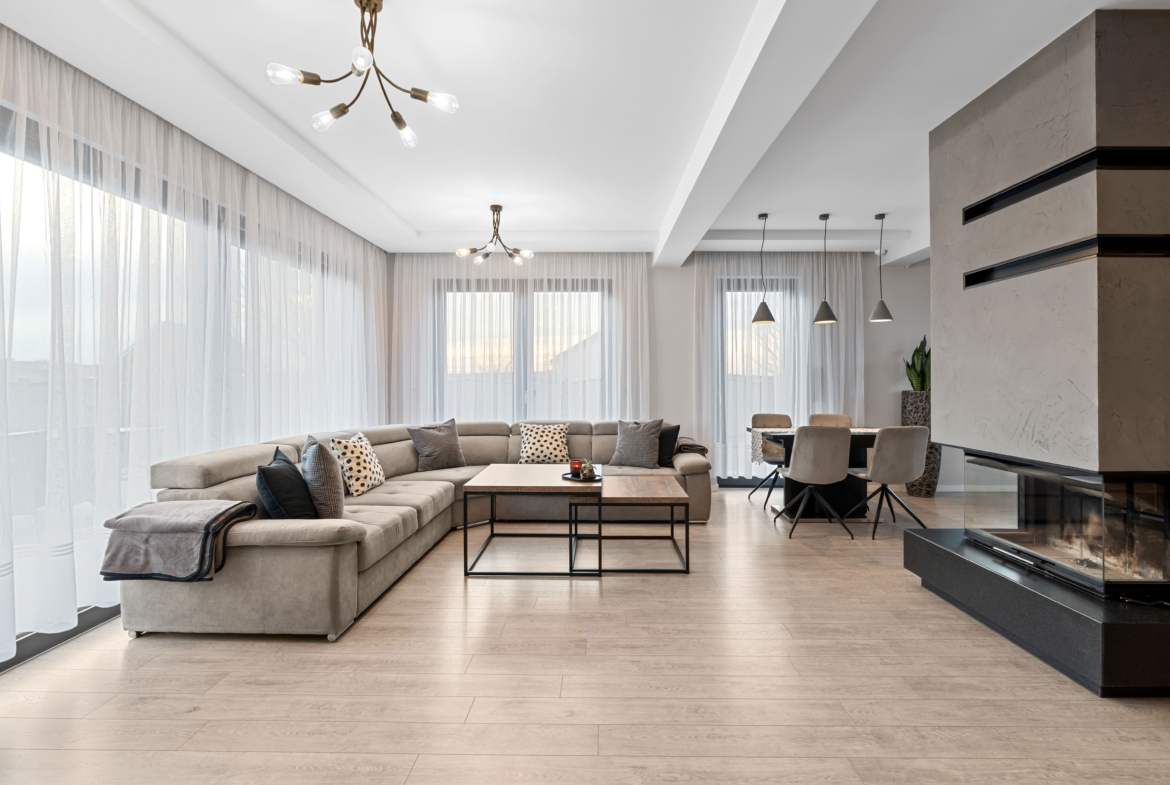 – parter stanowi duży salon z kominkiem, jadalnią i dyskretnie schowaną półotwartą kuchnią, łazienka, pokój, garderoba i przedpokój